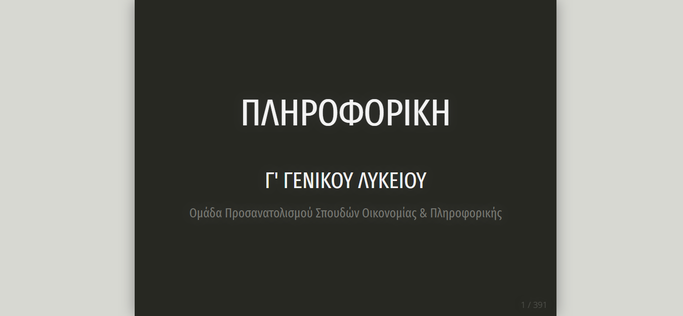 Όλο το υλικό του βιβλίου, θεωρία και ασκήσεις, σε μια “παρουσίαση” με πολλές παραπομπές στην ψηφιακή μορφή του και σε θέματα πανελληνίων εξετάσεων στο site του Υπουργείου Παιδείας.