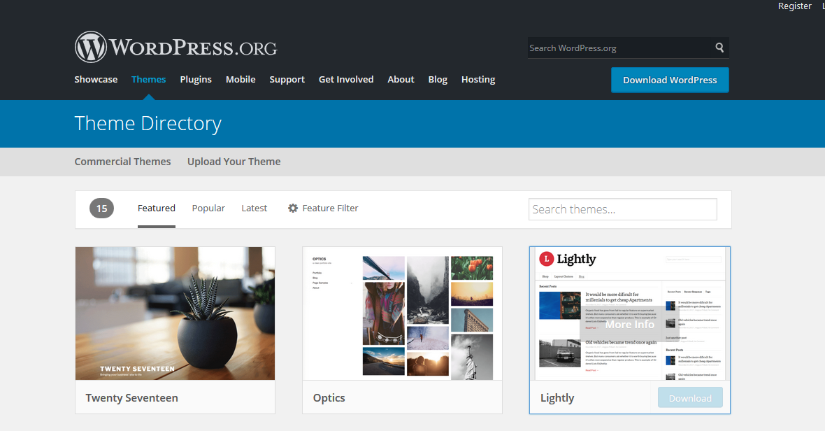Εναλλακτικά, μπορούμε να ψάξουμε ελεύθερα θέματα από την επίσημη ιστοσελίδα του Wordpress, να τα κατεβάσουμε (σε μορφή .zip) και μέσα από το περιβάλλον διαχείρισης να το ανεβάσουμε στο site μας. Το ίδιο ισχύει και με τα εμπορικά templates που αφού τα πληρώσουμε και τα κατεβάσουμε στον υπολογιστή μας (συνήθως σε μορφή .zip και αυτά), μπορούμε να τα ανεβάσουμε στο site μας από τη διαχείριση του Wordpress.